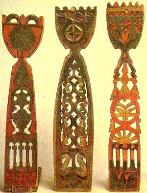 Россыпью геометрической резьбы украшались также вальки, рубели, солонки, совки для сбора ягод и другие изделия крестьянского обихода (рис. 8).