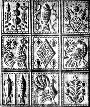 Особое место в искусстве резьбы занимают доски-штампы для пряников. Они представляют собой углубленную резную форму. В XVIII в. на одной доске вырезали несколько замысловатых форм и выпекали сразу целую партию нарядных пряников (рис. 9).