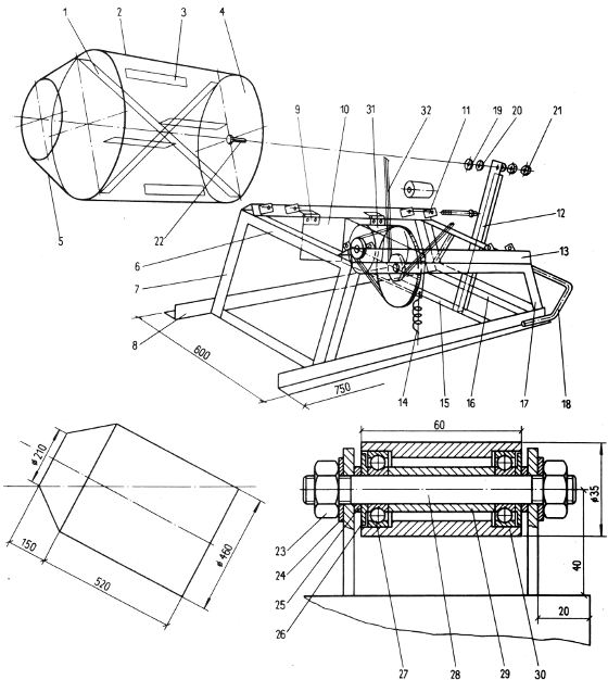 Угол наклона смесительного барабана во время работы зависит от его размеров, так что определить однозначно его нельзя. Как показали испытания, наиболее приемлем примерно тот угол, который показан на рис. 2. При выгрузке перемешиваемого материала из мешалки наклоняется вся мешалка. Поэтому к задней части мешалки приварена ручка 18. Вся рама 6, 7, 16, 17 состоит из уголка размером 30х30 мм, и лишь две нижние рамы 8, на которые устанавливают мешалку, изготовлены из уголка размером 50х30 мм. Ручка барабана 12 сделана из профиля размером 30х30 мм.